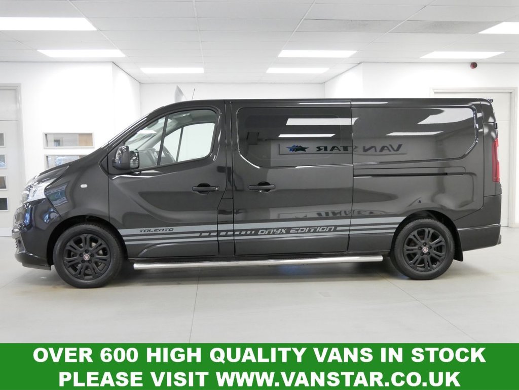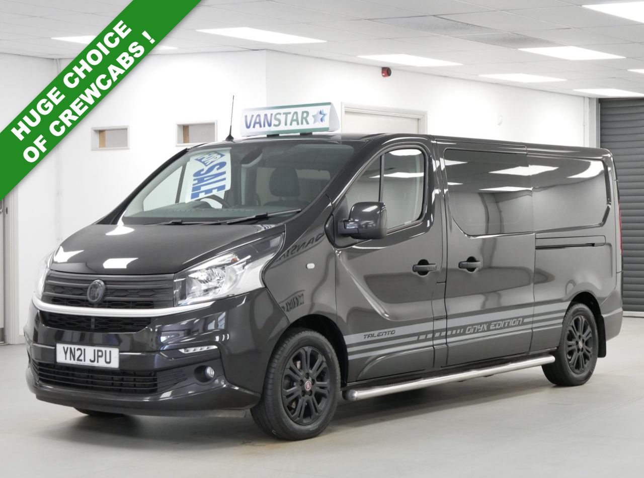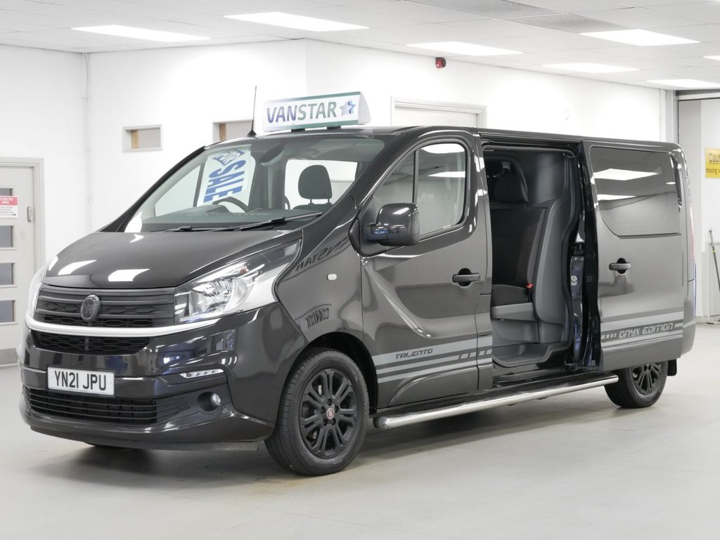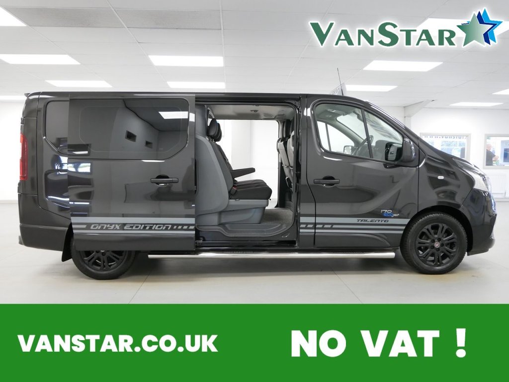 NO VAT ! . 2021 Plate Fiat Talento 12 2.0 MutliJet 170 BHP L2 Long Wheelbase Onyx Edition 6dr Crewcab Automatic 6 Seater . High Spec NO VAT Example in Black with Air Con / Climate Control , BLACK ALLOYS , FACTORY SAT NAV MEDIA , 6 SEATS , L2 LONG WHEELBASE , AUTOMATIC GEARBOX , Electric Windows + Mirrors , Privacy , Remote Central Locking , Bluetooth , Cruise Control , Factory Rear Parking Sensors , Reverse Camera , Chrome Side Bars , Cargo Lining , Plus all usual styling and refinements found in the High Spec Onyx Edition models . Euro 6 Compliant . 2 OWNERS , JUST 37000 MILES , Excellent History ( 2 x Main Dealer Services ) . Great Spec , Best of all , No VAT To Pay !