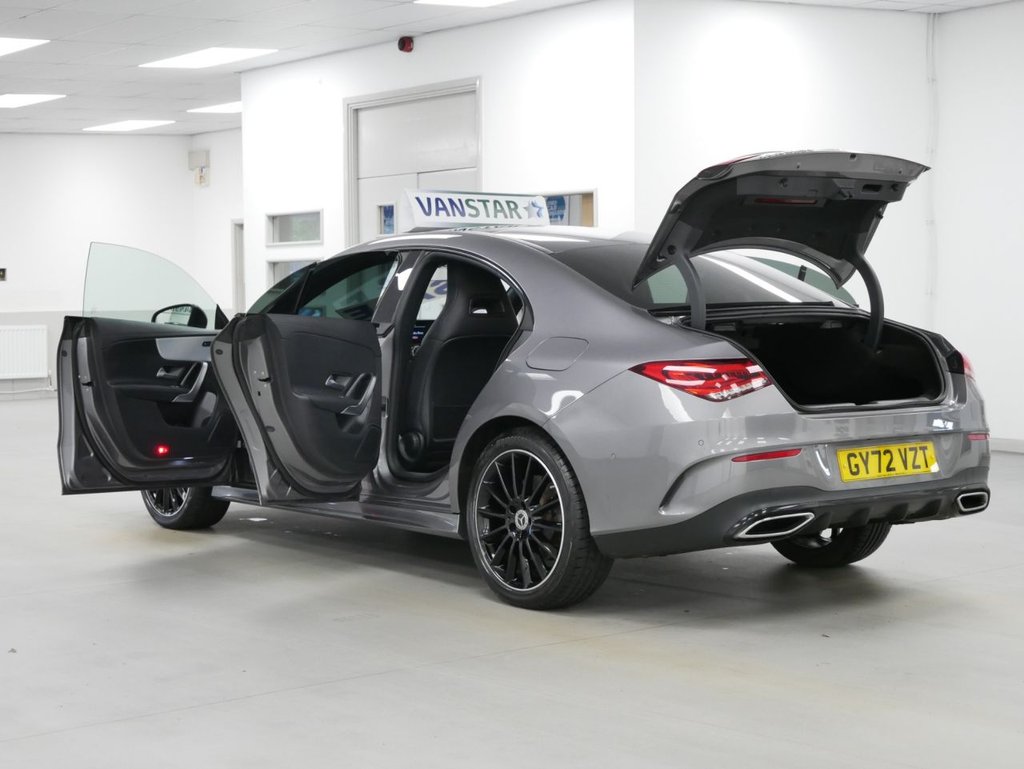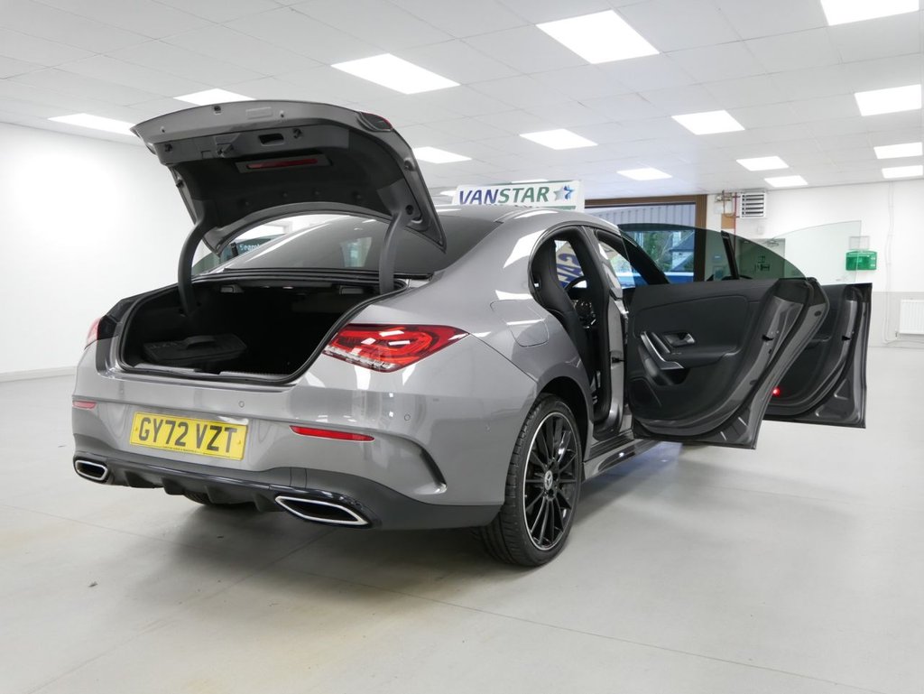 72 Plate Mercedes-Benz CLA250e 1.3 PHEV 260 BHP AMG Line Night Edition Premium Plus Coupe .. High Spec Example in Metallic Mountain Grey with Air Con / Climate , Upgraded 19' Black Night Edition Alloys , PREMIUM PLUS PACKAGE ( PANORAMIC GLASS SUNROOF , UPGRADED INTERIOR AMBEINT LIGHTING , UPGRADED SOUND SYSTEM , WIDESCREEN INFOTAINMENT DISPLAYS , KEYLESS ENTRY + START , ELECTRIC MEMORY SEATS ) , Night Edition Styling Pack , Plug-in Hybrid With Charge Cable , Full Black Leather Interior , Heated Seats , Electric Windows + Mirrors , Power Folding Mirrors , Privacy , Bluetooth , Cruise Control , Park Sensors , Reverse Camera , Plus all usual styling and refinements found in the Top Of The Range AMG Line Night Edition Premium Plus models .. Euro 6 Compliant / ULEZ .. Only 2 Owners , Just 27000 Miles , 2 x Main Dealer Services ! Great Spec , Ready to Go !